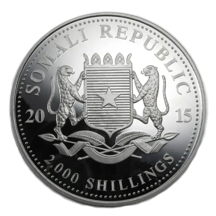 De 1 kilo zilveren Somalische Olifant munt is een indrukwekkende beleggingsmunt die jaarlijks wordt uitgegeven als onderdeel van de African Wildlife-serie. Deze munt bevat maar liefst 1.000 gram puur zilver (99,9%). De voorzijde van de munt toont jaarlijks een ontwerp van een olifant in zijn natuurlijke leefomgeving – een symbool van kracht en majesteit. Dit maakt elke editie uniek en geliefd bij zowel beleggers als verzamelaars. Op de keerzijde staat het wapen van Somalië met het jaartal en de nominale waarde.